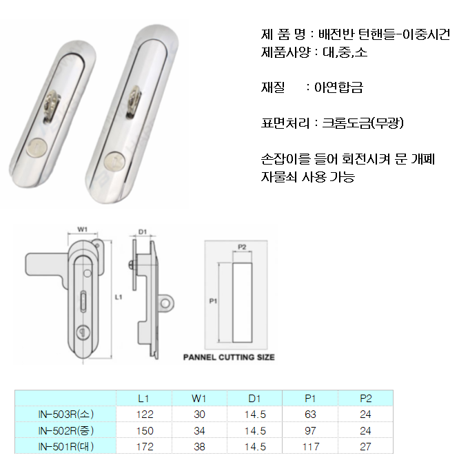 FLUSH&TURN 턴핸들-이중시건 IN-501R/502R/503R 페이지 정보 작성자 관리자 댓글 0건 조회 1,702회 작성일 20-07-06 12:22 이전글 다음글 목록 본문 유사 기능 제품 MS-834, MS-4008Z 목록