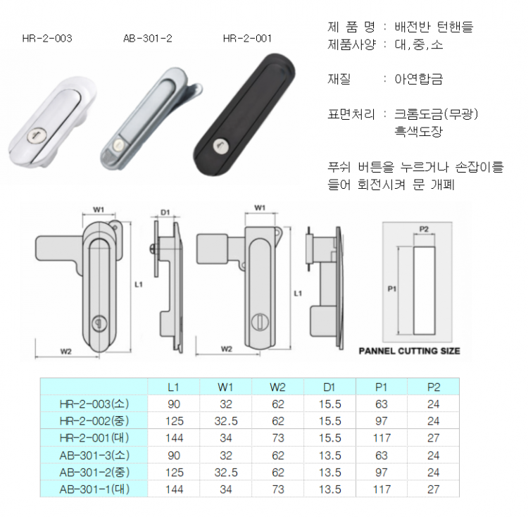 FLUSH&TURN 배전반 턴핸들 HR-2-001, AB-301 페이지 정보 작성자 관리자 댓글 0건 조회 3,764회 작성일 20-07-03 16:54 이전글 다음글 목록 본문 호환 가능 제품 (D1 치수 상이) AB-2401/2402/2403(D1=14.5) AB-302(D1=15.5), AB-401(D1=15), AB-402(D1=11) MS-607(D1=15), MS-751(D1=22) 목록