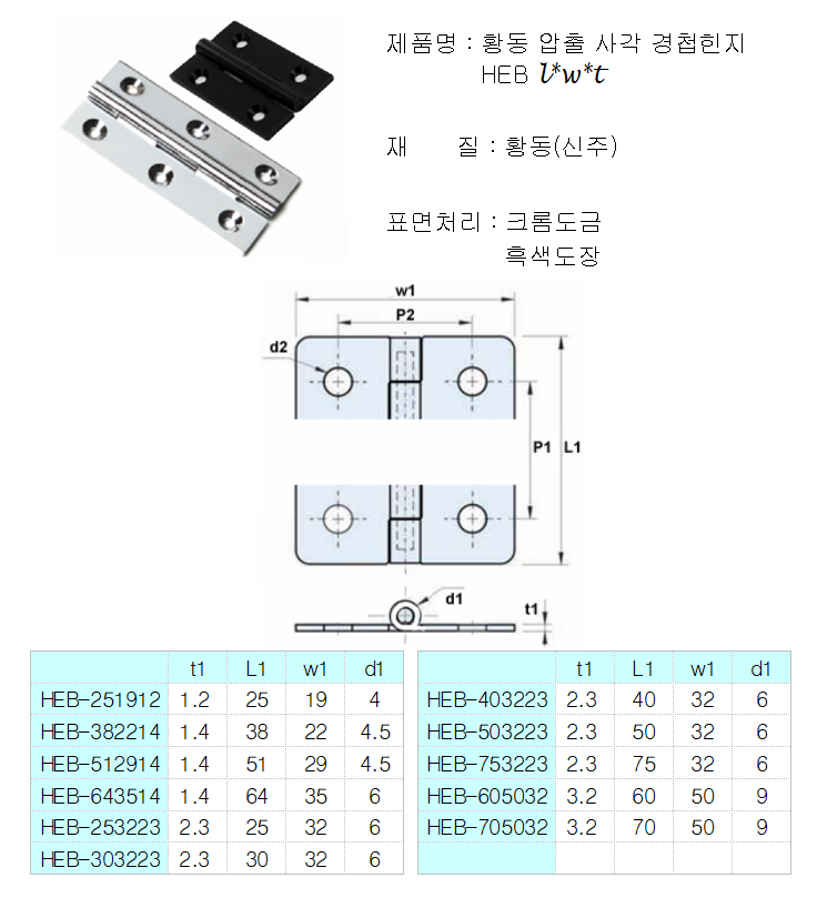 황동 압출 사각 힌지 HEB l*w*t